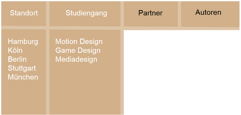 So top links should be the MHMK logo, on which you could click to get to the homepage of the MHMK. Next to it, the name of the blog should be in large letters. Among them is a large static image in landscape mode. Static to keep the blog as simple as possible. It is not intended to distract effects from the blog entries and these are highly text-heavy and moving images in the header would attract too much attention. Below the image is the navigation. Consisting of authors, partners, location and study programmes. Special emphasis is placed on the authors and partners, because this will be of the greatest interest to employers, so with which big names have the students already worked and above all who has done this work? As mentioned earlier, the blog is particularly designed to "attract" employers (at our Personas Peter Professional) and these two questions will be of great interest to them. In addition, the navigation tab "Partners" is also of great interest to graduates who want to see which companies the students come into contact with. The riders location and study course should focus on the MHMK (which locations are there? How many courses are involved in the blog, etc.?) and on the other hand, it helps the visitor to find his way around the site better.