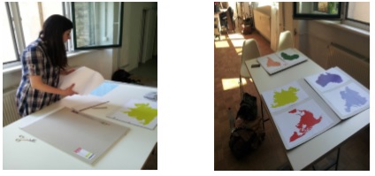 2. Glue continents onto the cardboard (watch out: paint the continents smoothly on the cardboard with a soft cloth)